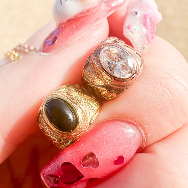 シルバーとゴールドにはオニキスを。 ピンクゴールドにはジルコニアをセットしたカレッジリング風の珍しいベビーリングです。